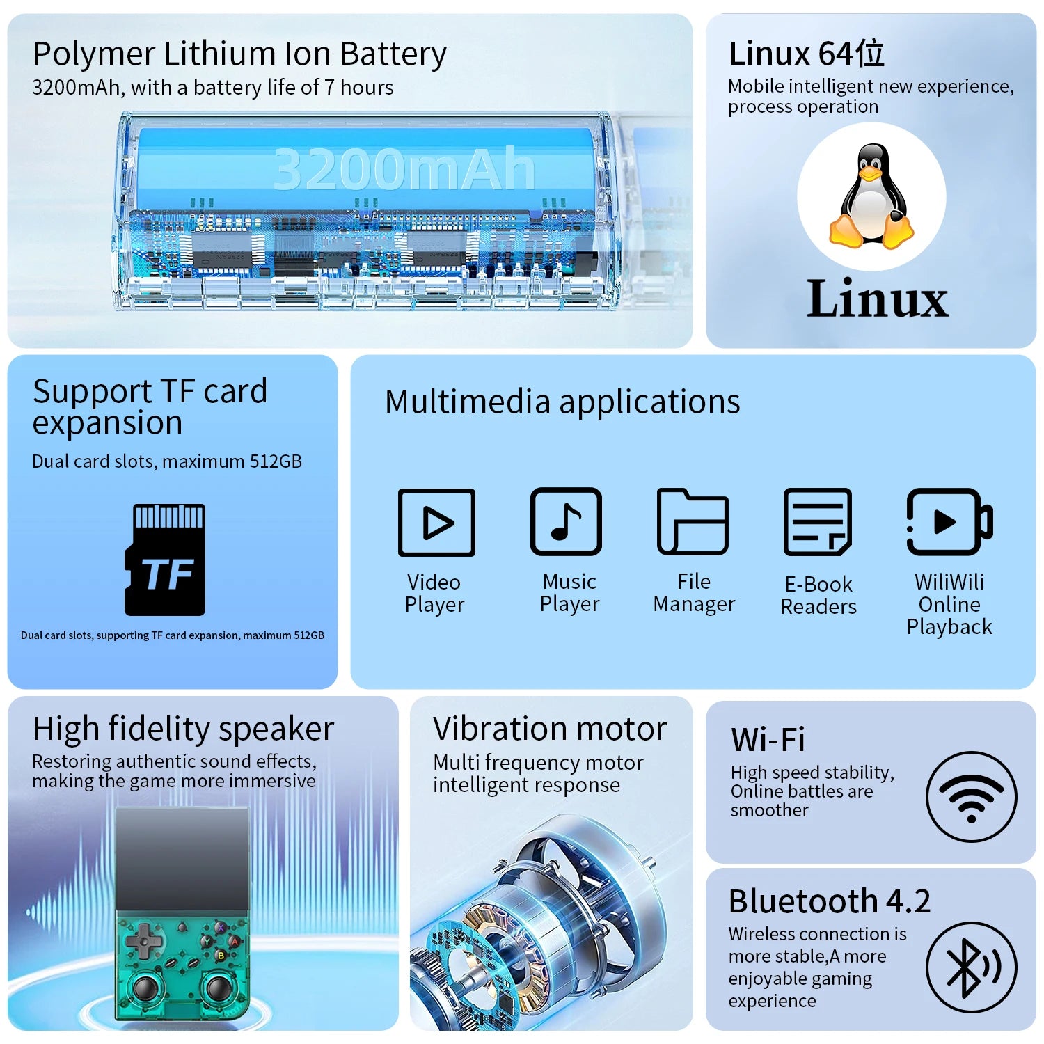 Running on Linux 64-bit, the RG 35XXPRO stay connected with 2.4/5G WIFI 802.11a/b/g/n/ac and Bluetooth 4.2, enabling smooth online multiplayer experiences and convenient streaming.