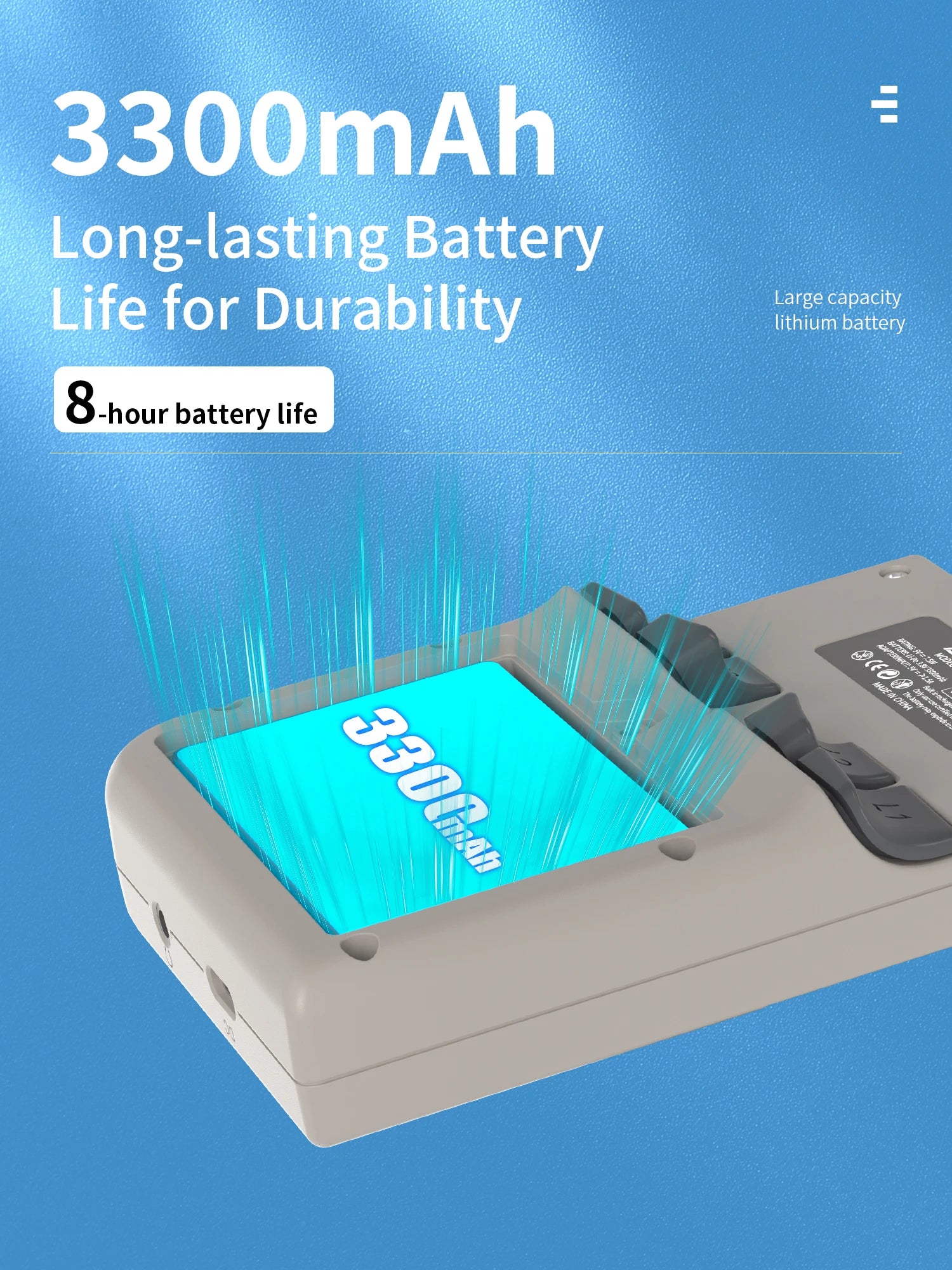 Li-polymer battery 3300mAh, lasting 8 hours |