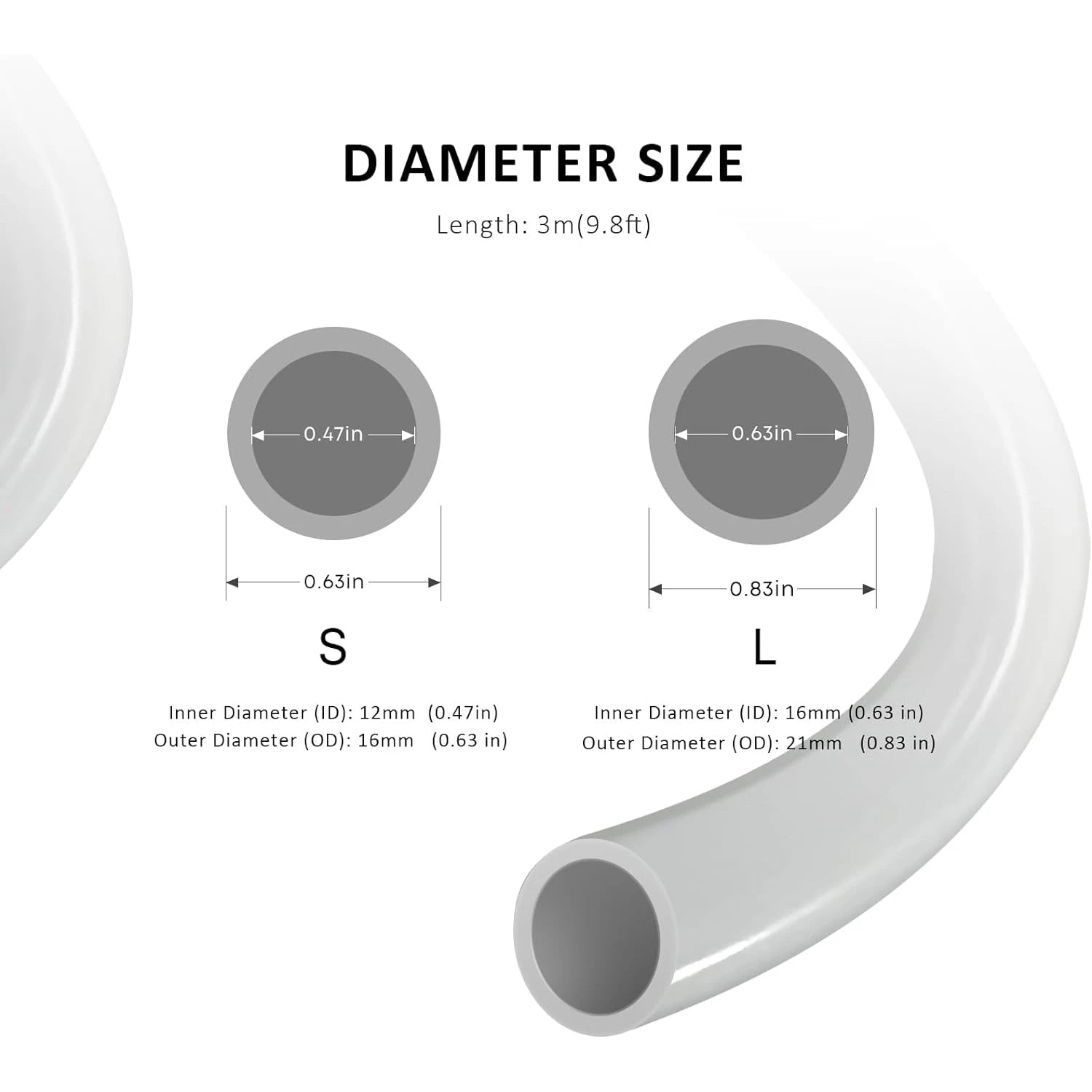 SPECIFICATIONMaterial: PVC Length: 9.8 ft (3m) S Inner Diameter (ID): 12mm (0.47in) Outer Diameter (OD): 16mm(0.63 in) L Inner Diameter (ID): 16mm (0.63 in) Outer Diameter (OD): 21mm (0.83 in) |