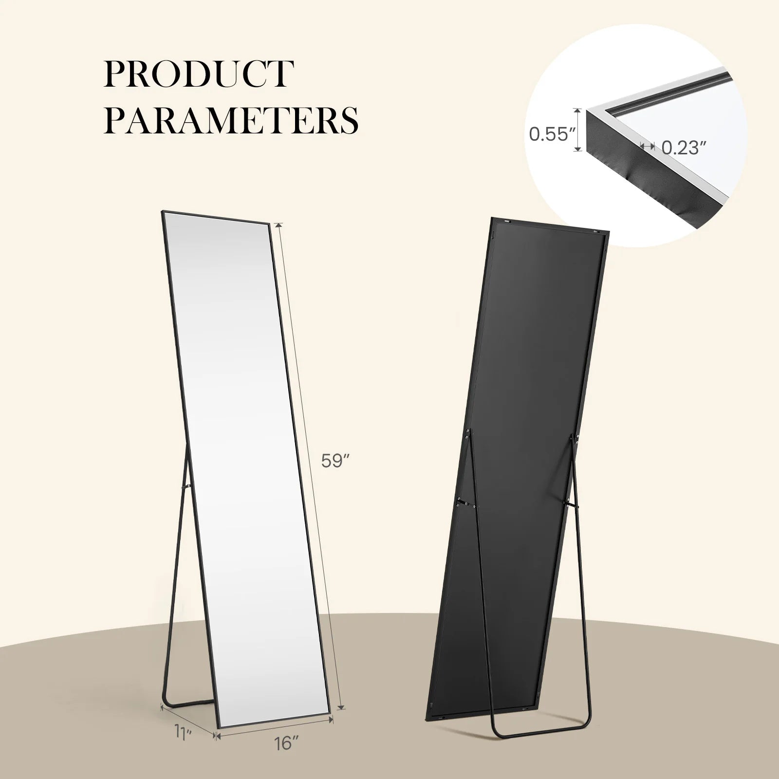 JHK Full Body Wall Mirror 59"x16"/64"x21" Standing or Wall-Hanging with Stand Aluminum Alloy Frame Bedroom Cloakroom Decoration