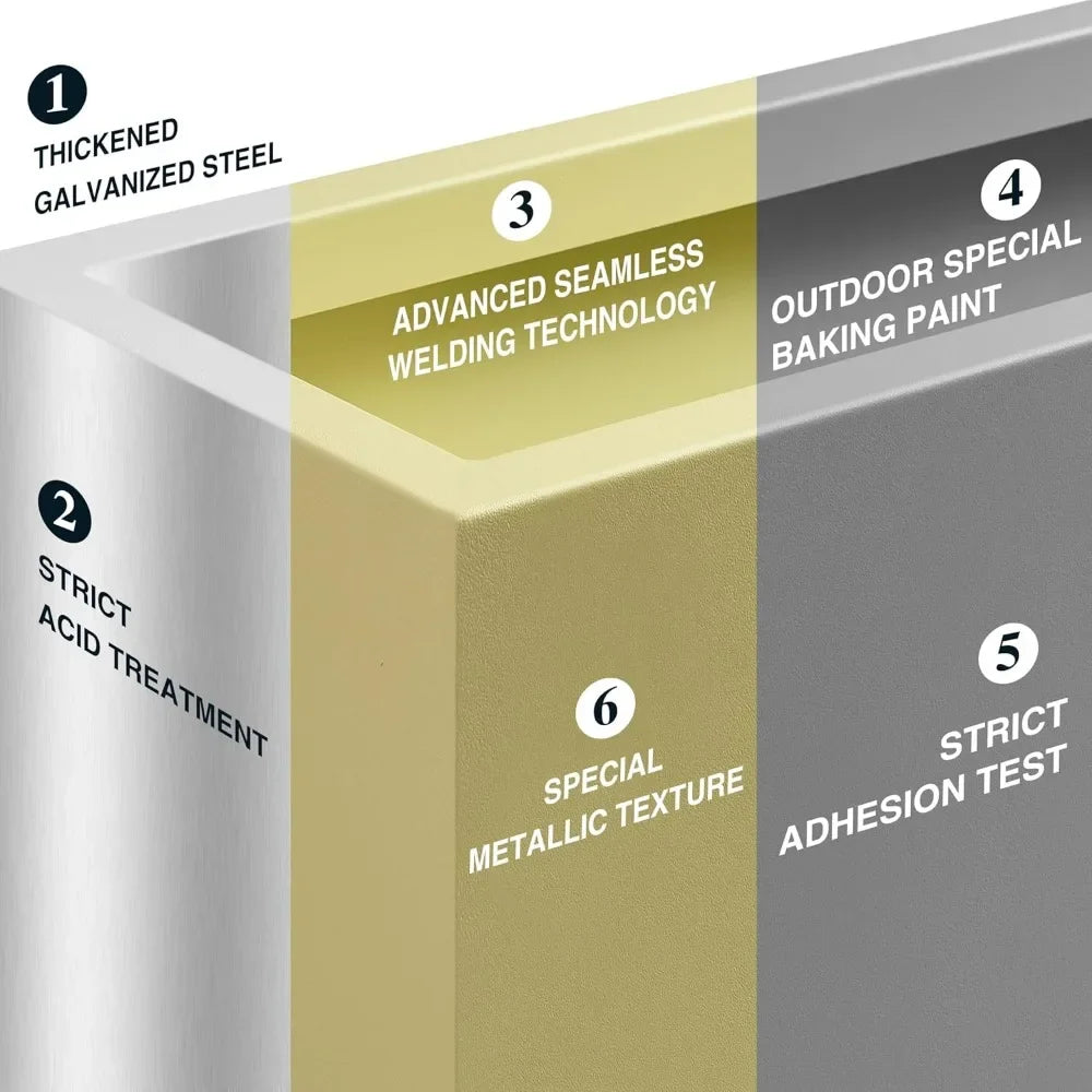 【Span Metal Planter】This tall planter box is made from a fully seam welded thick galvanized steel, and adopts outdoor special baking paint, giving the surface a premium metallic color and special texture through the advanced powder injection process.
