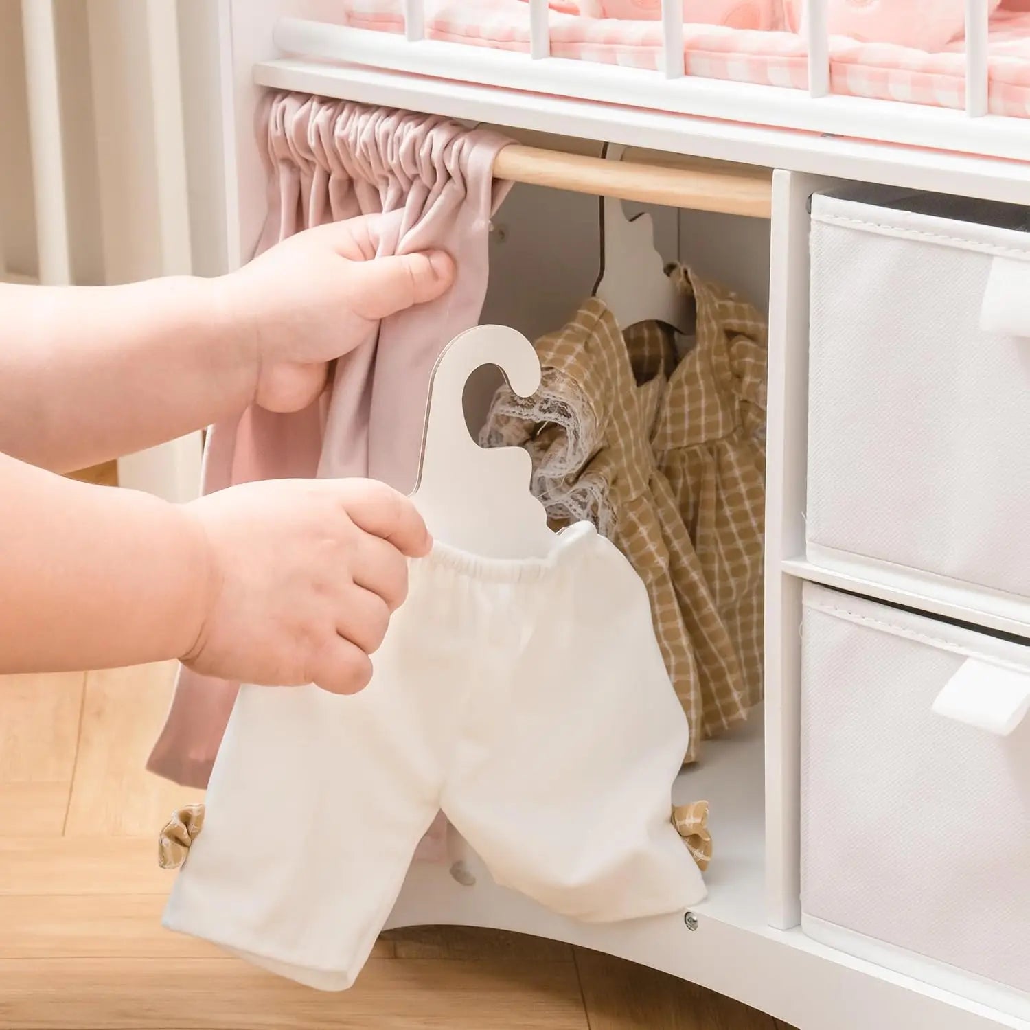 - All-in-One Design: Combines a crib, changing table, and storage unit in one functional piece. Includes two baskets and three wooden hooks to keep doll clothes, toys, and pretend toiletries neatly organized.