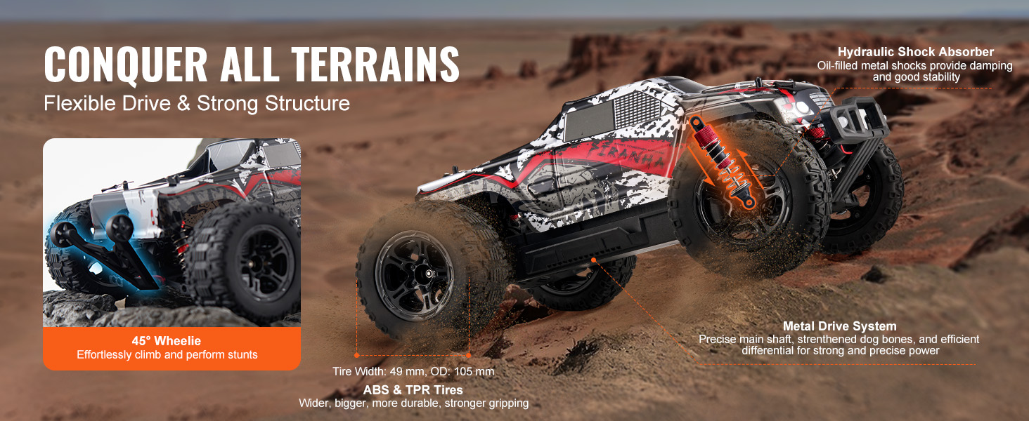 Unrivaled Driving Enjoyment: Upgraded with a wheelie bar, this RC off-road car can lift its front wheels up to 45° for thrilling stunt shows. The 45° steering angle, high-precision servo, and hydraulic shock absorber ensure smooth navigation through sharp turns, steep slopes, and rough terrains.