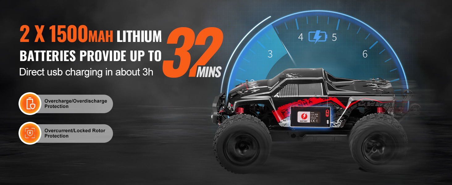 Long Battery Life and Quick Charging: Equipped with two 1500mAh lithium batteries, this all-terrain RC truck provides strong and lasting power. Kids can enjoy up to 32 minutes of racing. The accessible USB port and fast charging feature mean it gets back on track in just 3 hours.