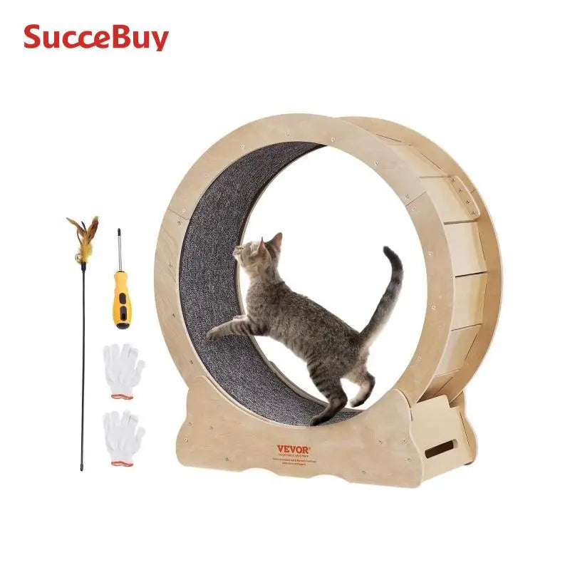 - User-Friendly Design: Easy installation with pre-installed expansion screws and wheel, saving you valuable time. Included accessories like gloves, a screwdriver, and a cat teaser add extra convenience. This cat treadmill is a breeze to clean with a non-scratch detachable looped mat, easily spot-cleanable with a cloth or sponge.