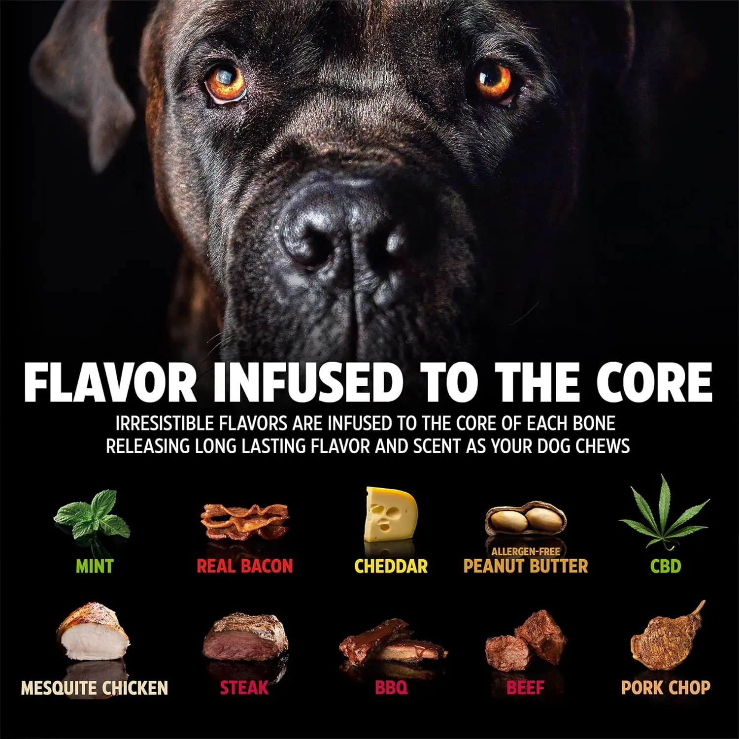 - Delicious bacon flavor infused to the core of every bone, releasing long lasting flavor & scent as your dog chews.